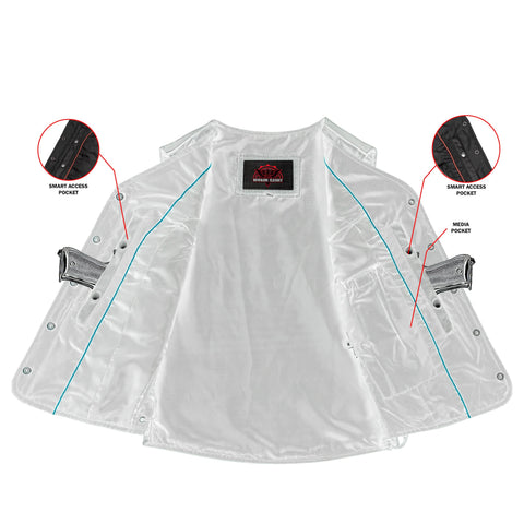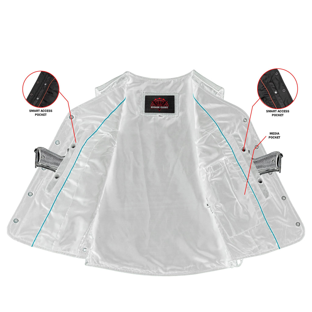 2 inside concealed gun pockets made of special heavy duty textile with built-in holsters and snap closure.